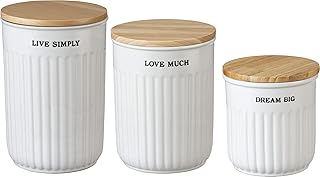 Primitives by Kathy モダン ファームハウス ネスティング キッチン キャニスター ジャー 木製気密蓋付き ホワイト ストーンウェア 素朴なコンテンポラリー 容器 小麦粉 砂糖 コーヒー ティーストレージ 3個セット