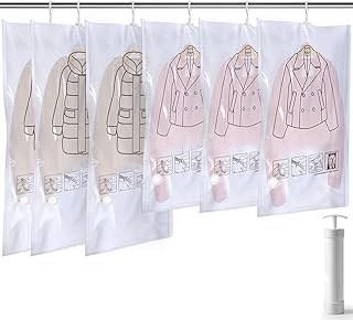 吊るせる衣類圧縮袋 6枚組 布団圧縮袋 ふとん収納 圧縮パック衣類収納袋 吊るす 圧縮 袋 吊り 下げ 省スペース 防湿気 防埃 防虫 カビ ダニ対策 抗菌効果 繰り返し利用可能 洋服カバー クローゼット収納 吊るす収納 手動ポンプ付